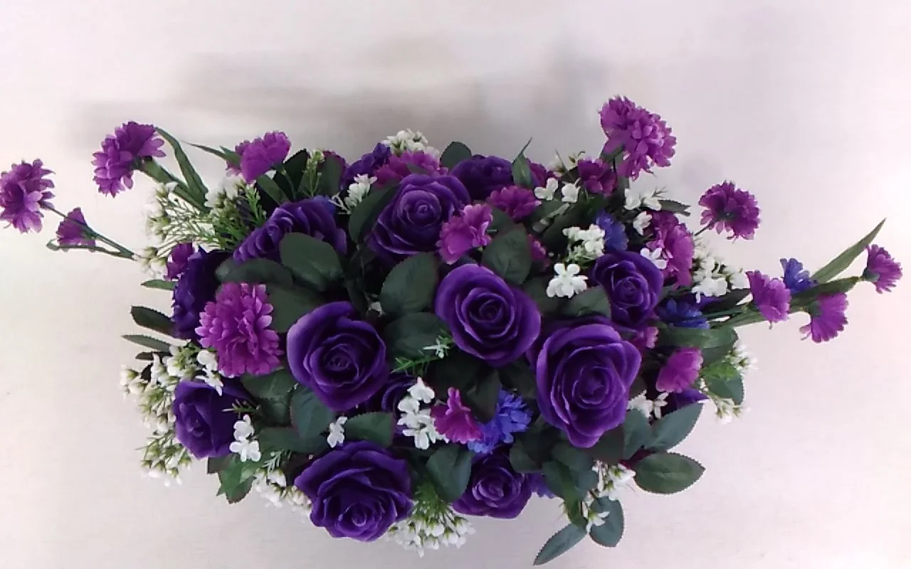 Soft and elegant purple and white premium silk flower arrangement sitting beautifully in a wicker basket